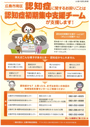 広島市南区医師会では広島市からの委託事業として、令和元年10月1日から「認知症初期集中支援事業※」を開始し、「認知症初期集中支援チーム」を設置しました。認知症初期集中支援チームの役割は、認知症になっても本人の意思が尊重され、できる限り住み慣れた地域のよい環境で暮らし続けることができるよう、適切な医療サービスや介護サービスに繋げることです。本事業により認知症の早期診断・ 早期対応に向けた支援体制の構築を目指していきます。